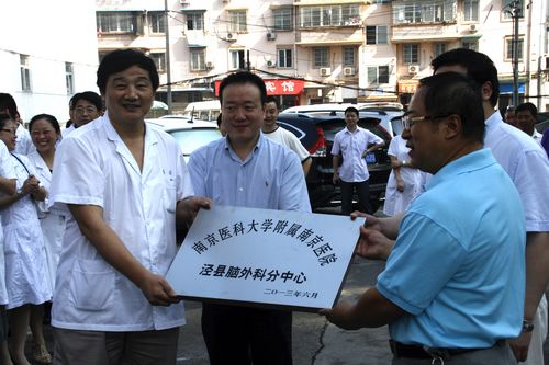 7月13日,“南京医科大学附属南京医院泾县医院脑外科分中心”授牌仪式在我院门诊广场隆重举行,南京医科大学附属南京医院院长张颖冬、副院长王书奎,县卫生局万伙顺局长及我院领导班子成员参加了授牌仪式。