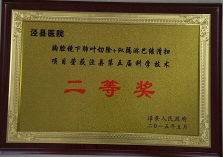 我院“胸腔镜下肺叶切除+纵膈淋巴结清扫术”、“经皮肾穿刺输尿管镜下钬激光碎石术”分别荣获泾县第五届科学进步二、三等奖。