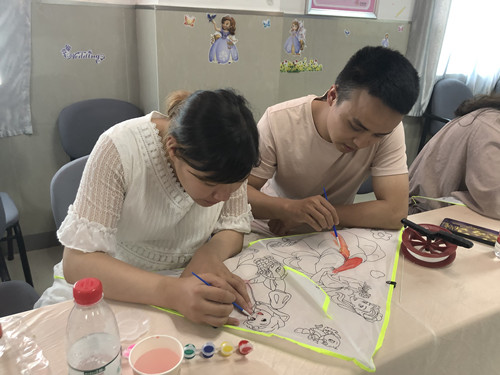 体验结束后,准爸爸、准妈妈们开始了“风筝涂鸦”手工胎教课。