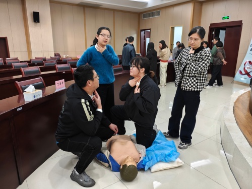 活动现场,心血管内科主任胡正光首先讲解心梗的早期识别技巧——比如“胸痛超过20分钟不缓解、伴大汗淋漓”就是典型信号,发生急性心梗时如何自救,如何拨打120;随后急诊科医生尹国伟为大家普及心肺复苏相关理论知识,重点演示CPR操作:从判断意识、呼叫求助,到双手交叠按压胸部、开放气道,每一个步骤都清晰拆解。现场的员工在医生的指导下,踊跃参与到模拟人心肺复苏的操作学习之中,经过理论与实践操作培训,每个人都从中受益匪浅。